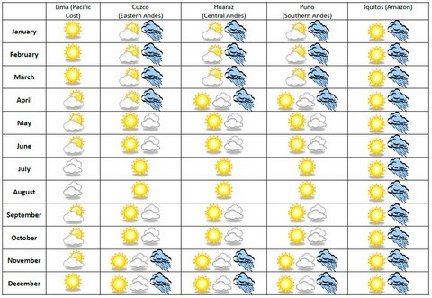 Il est possible de visiter le Pérou en toute saison, mais la saison idéale pour la pratique des bivouacs dans les Andes est d'Avril à Octobre. Sur la côte Pacifique, la saison de la baignade est de novembre à mars. Les plages se remplissent surtout en Janvier et Février. Quant à l'Amazonie, il y fait toujours chaud et les pluies les plus abondantes arrivent entre Avril et Octobre.